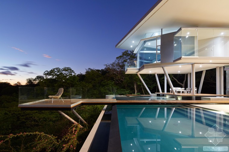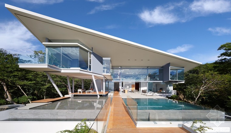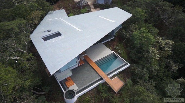Indios Desnudos 別墅在加約半島,位處于朝海的一個尖端處,略向下傾斜的半島形山脊,兩邊有森林(其中一個是自然保護區)。這個名字來自于場地里最有特點的一些樹:indio desnudo(赤裸的印第安人),它們組成了別墅的一個焦點,特別在居住區。別墅的設計旨在讓人享受室外生活和視野。因此,它被設計成在沒有空調的條件下仍然能舒適生活的建筑。室內空間與室外空間相整合,在室內的同時感覺像在室外。所有的居住空間都有通向大海或是森林保護區的視野。它有其主要的通向大堂的通道,你可以通過它看到社交區和大海。從這里你可以使用像木棧道一樣的走道,懸在分散的河石上,組成了流線的兩條軸線,組成樓層平面圖,或者使用樓梯通過橋梁到達兩個主臥室。